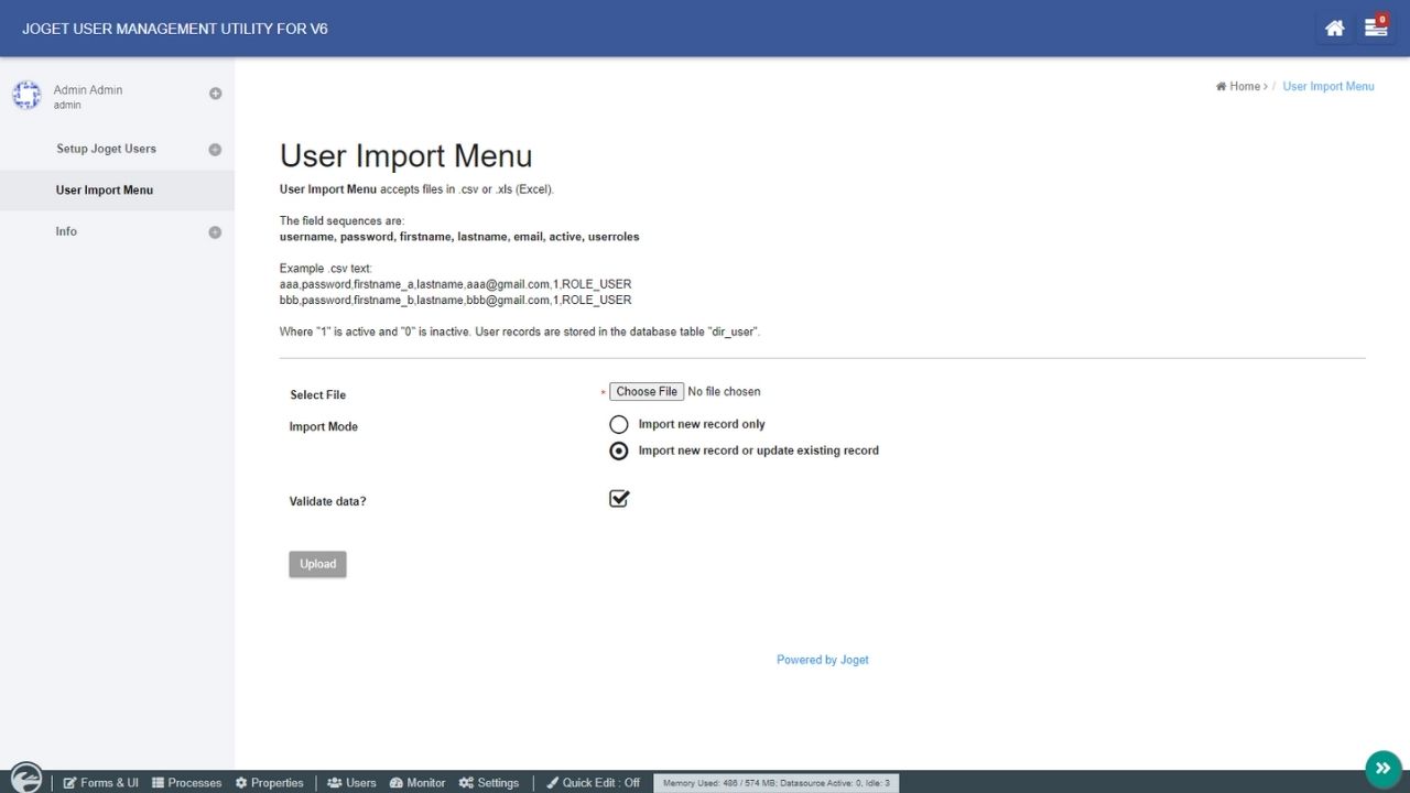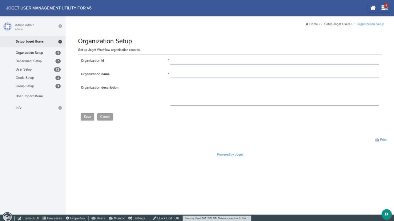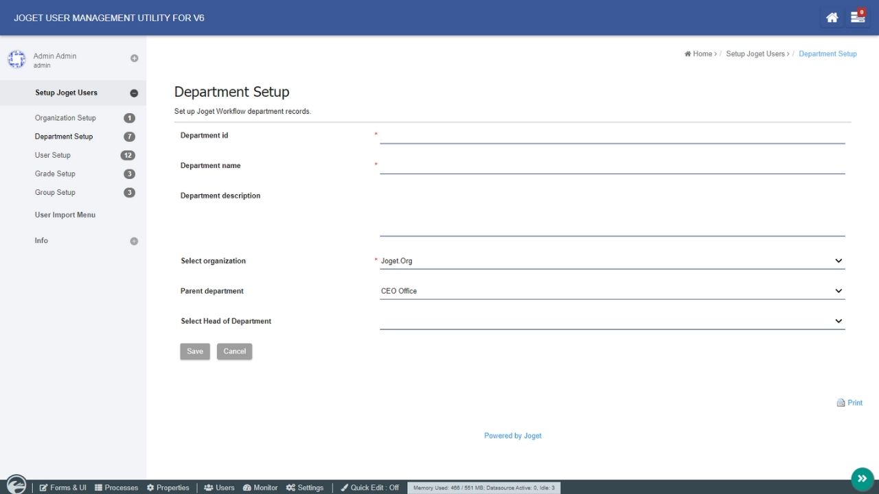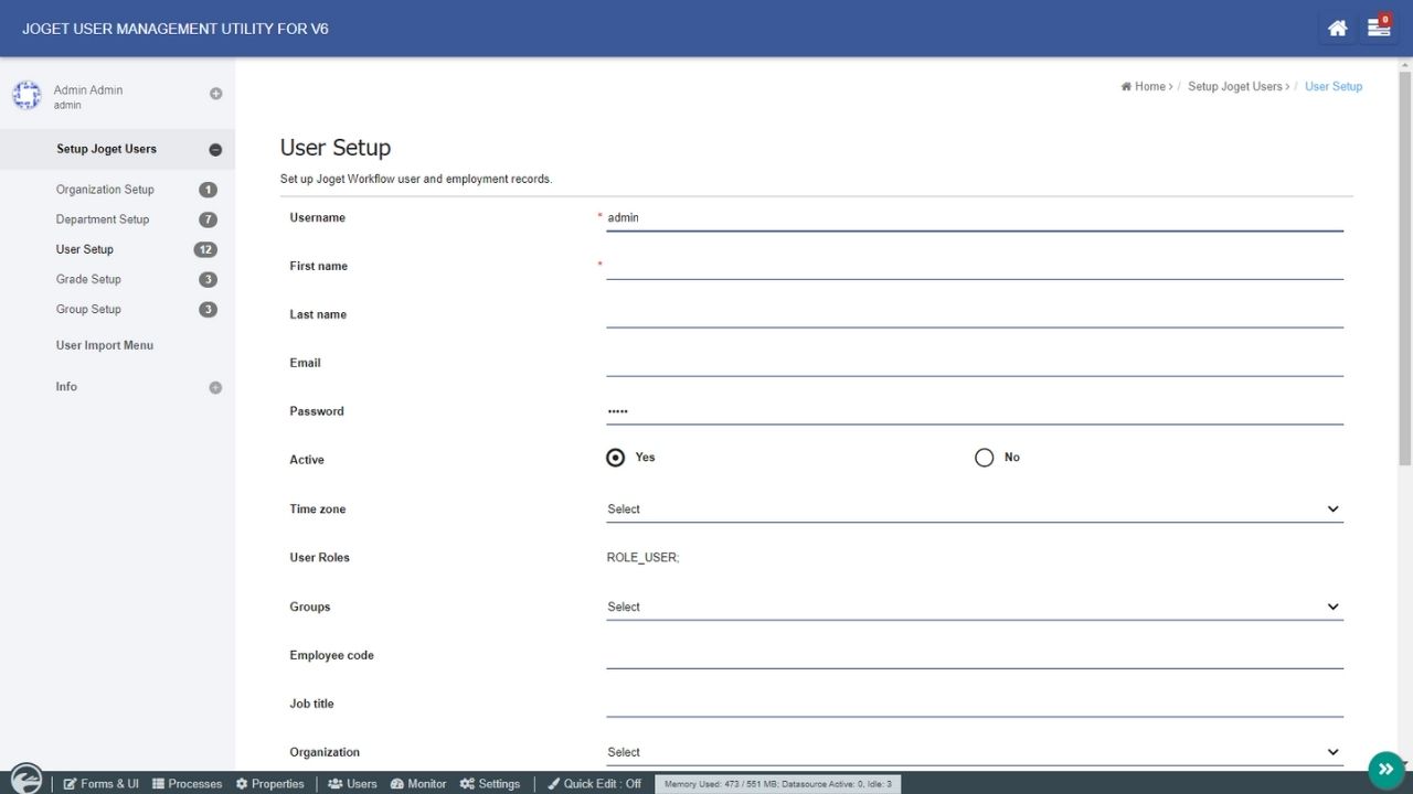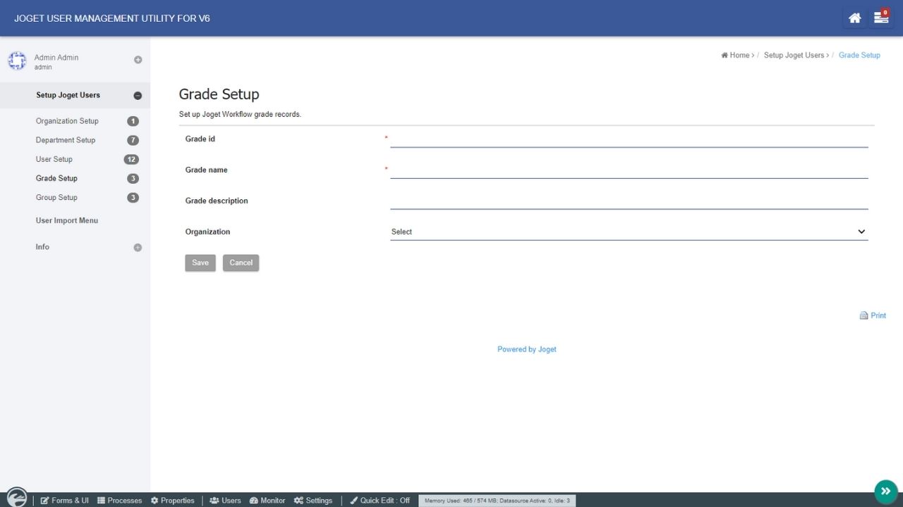 Easily add and manage Joget user accounts, departments, grades, groups, and organization records using the Joget User Management Utility app.