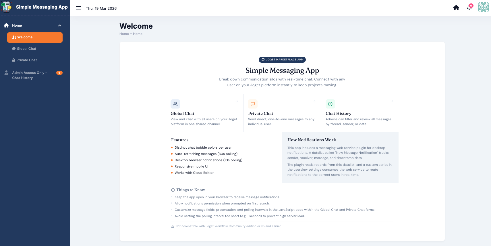 - The Messaging App is not compatible with Joget Community edition (all versions), and Joget v5 and earlier.