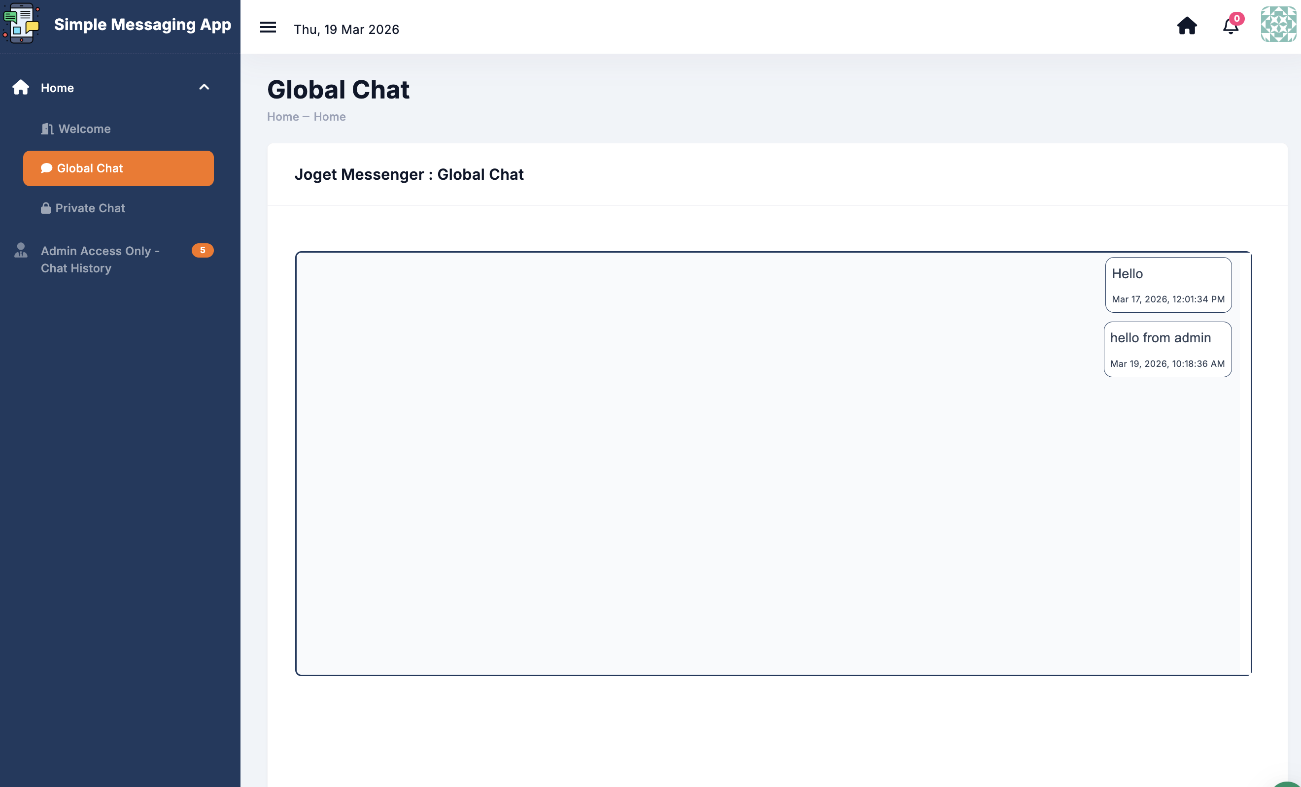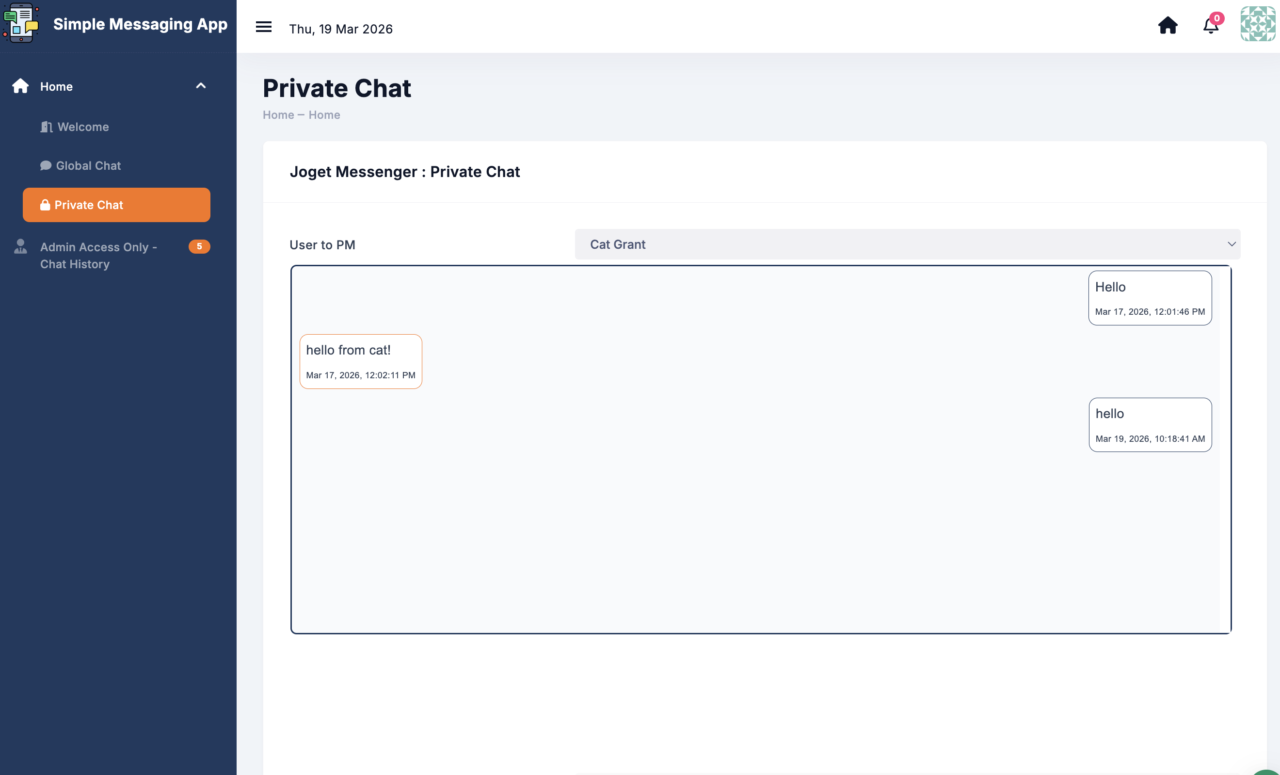Welcome to Simple Messaging App for Joget DX8 Enterprise, Professional, and Cloud editions. You can easily chat with Joget users within your organization using this app.