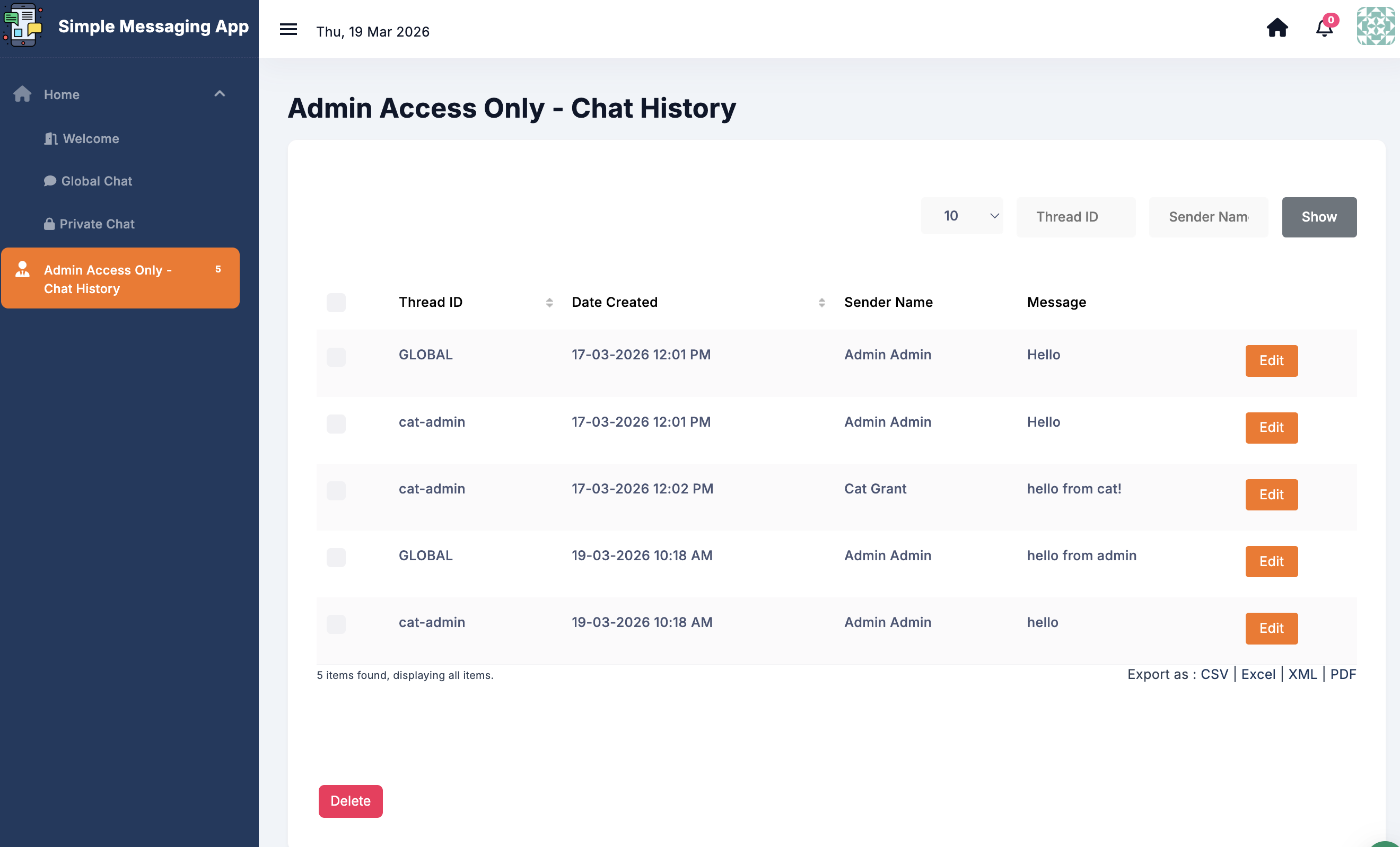Administrators can view all messages via the Chat History menu. The Chat History menu contains datalist filters for administrators to conveniently filter chat history according to thread, sender and date.
