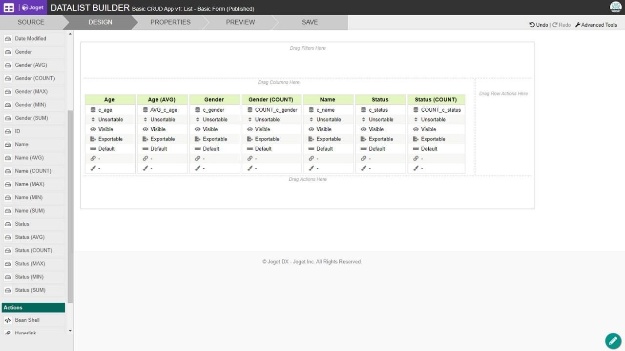 There are five aggregate data functions you can select from the datalist designer column palette: