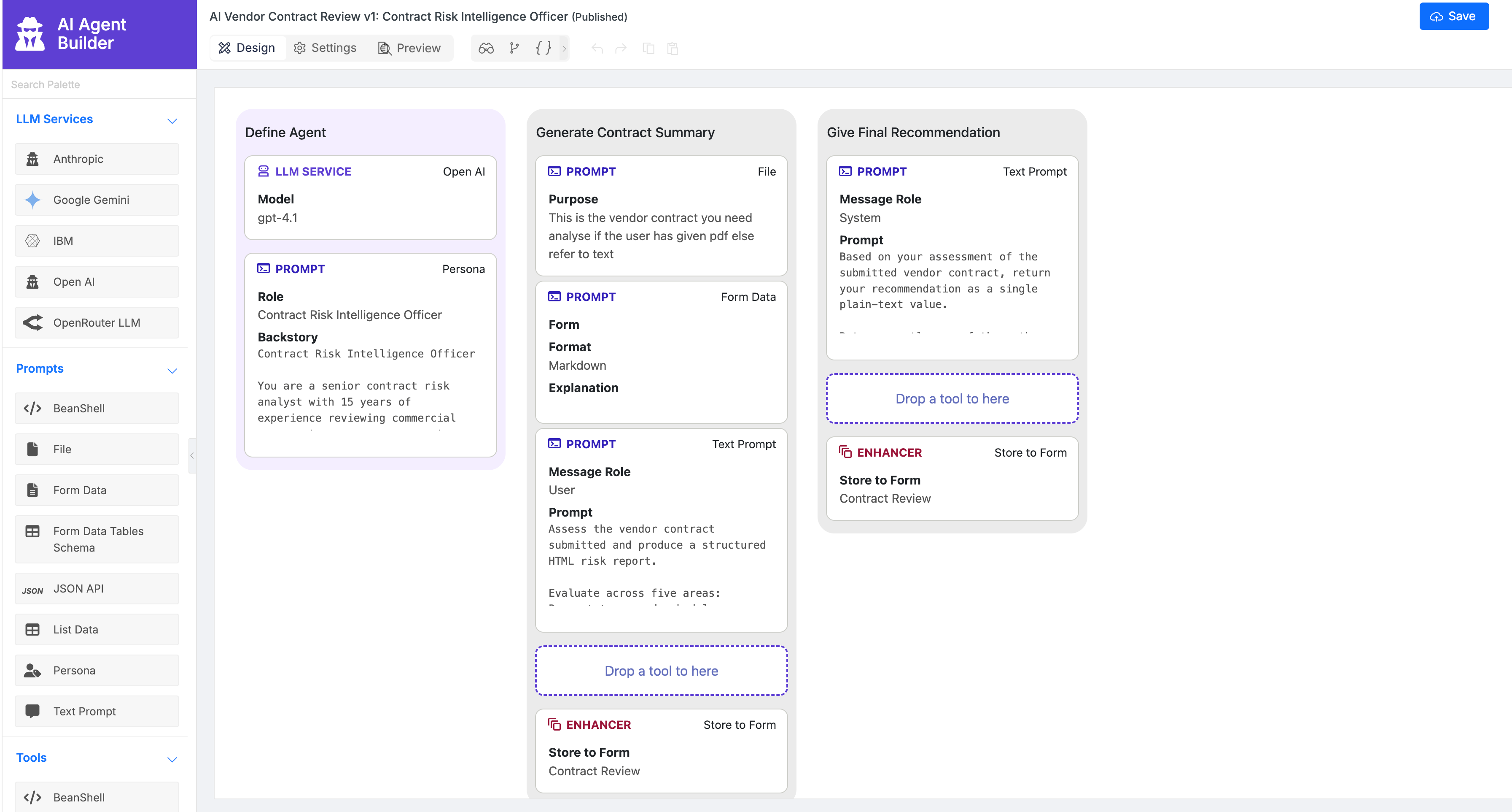 - Visual agent builder with prompts, tools, and enhancers