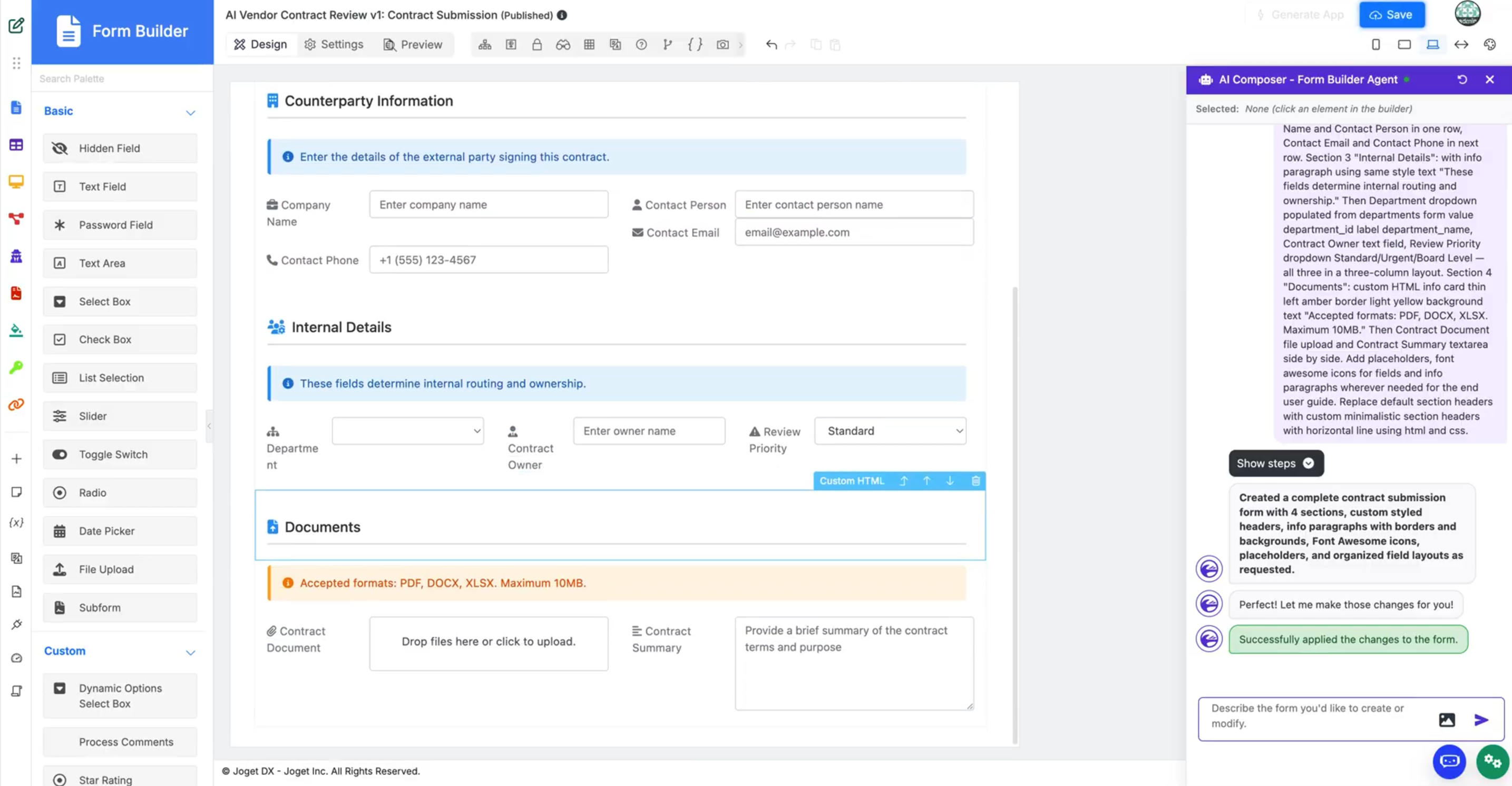 2. AI Composers - NEW: Build Joget applications through conversation. Five composers (Form, List, Process, UI, Theme) let you create and modify apps via prompts — a new way to vibe compose your Joget apps.