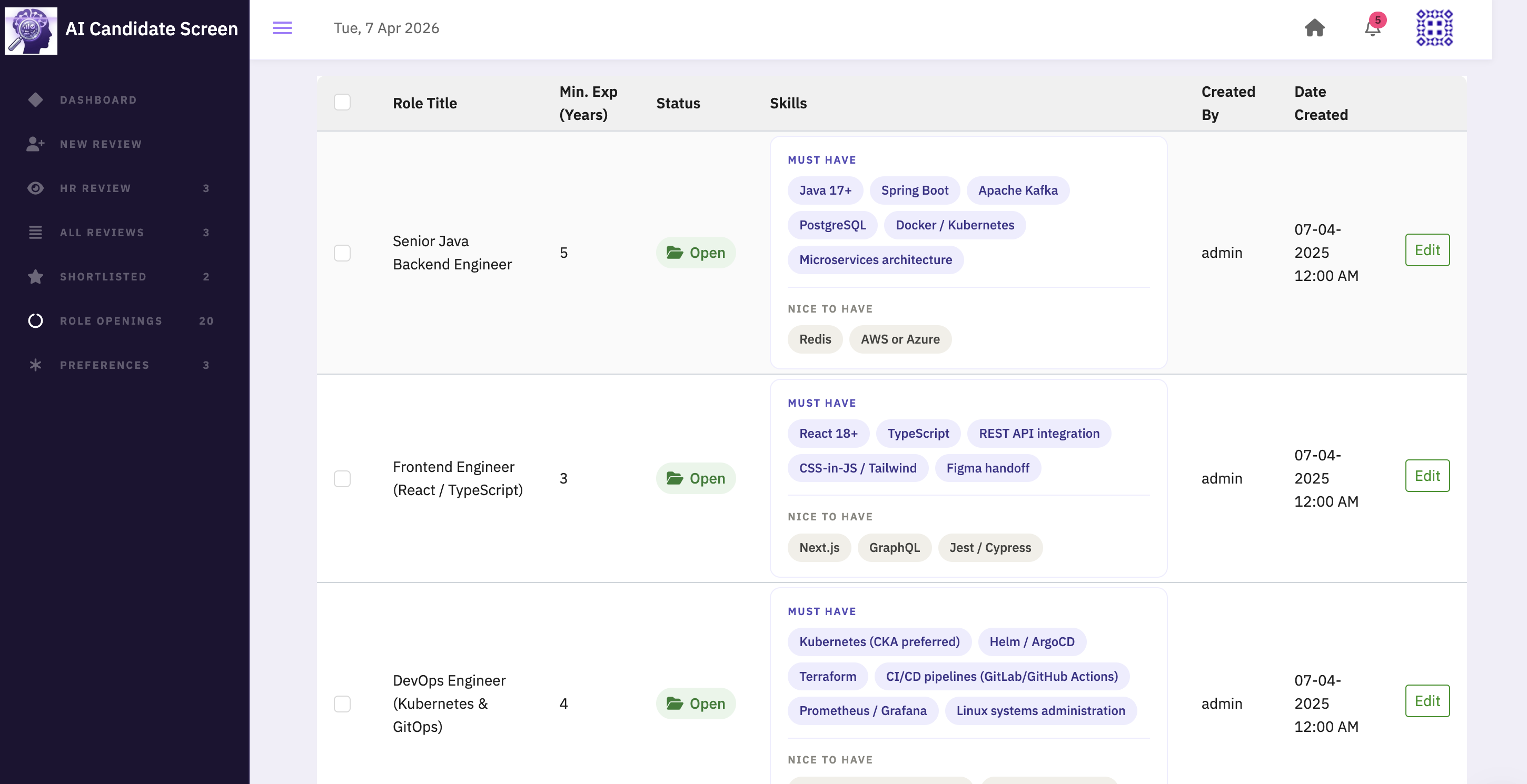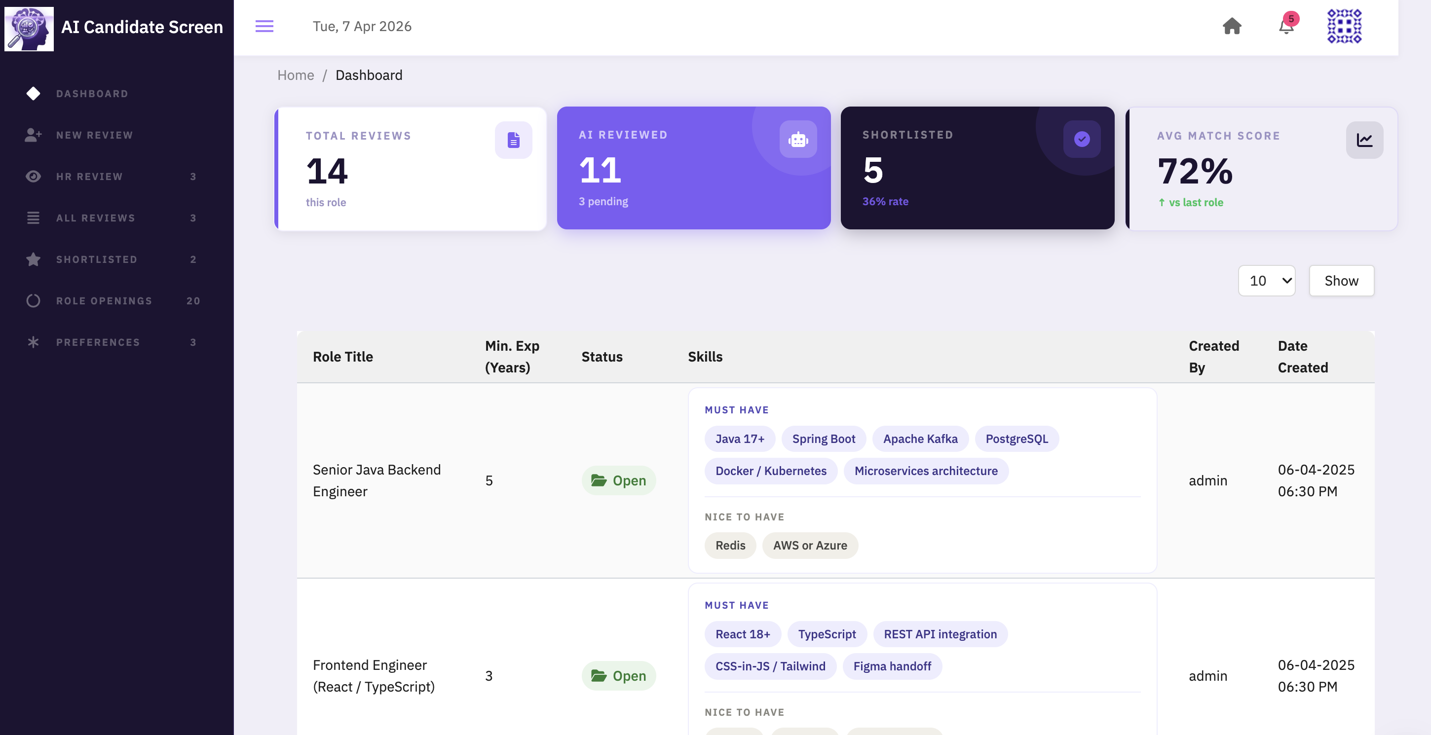 - Drop in a role, upload resumes, and let AI do the first pass.