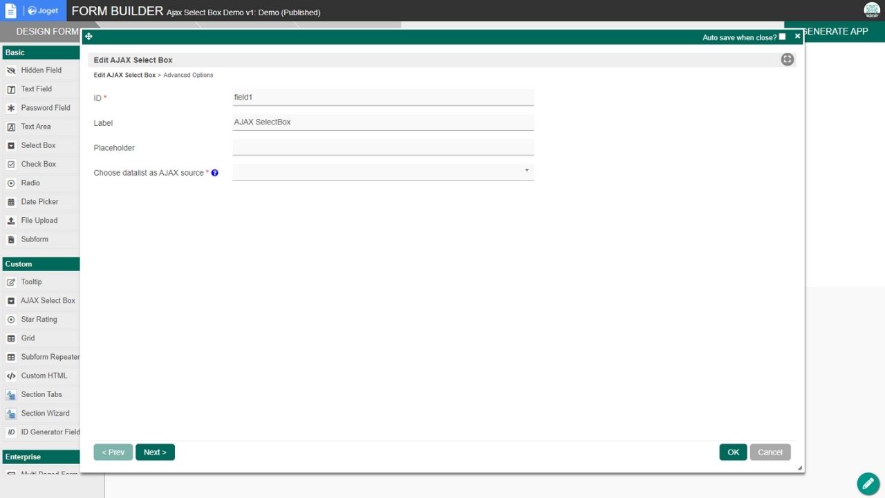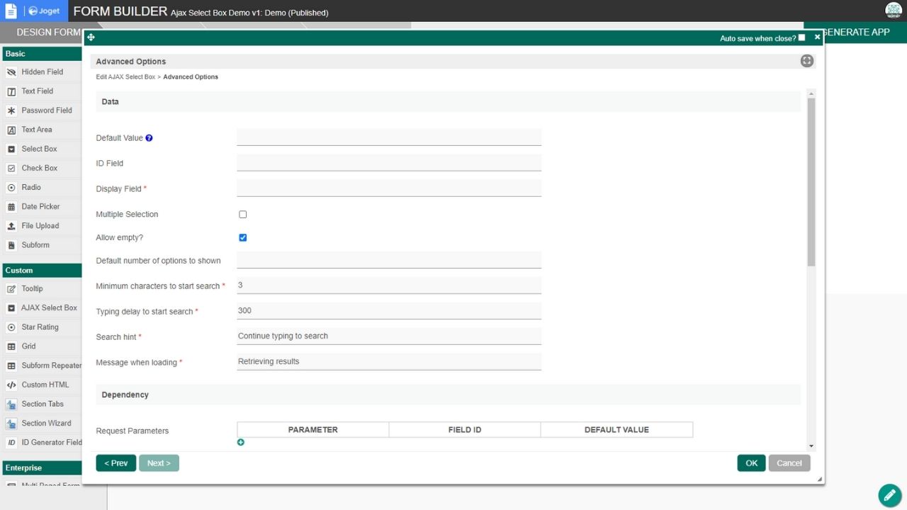 The AJAX Select Box Plugin is a new form element that uses AJAX to retrieve options by populating the select box based on the selected datalist. Users can type in the search filter and it will dynamically retrieve the available options as the user continues to key in. Click the images on the right for sample screenshots. You can also download the demonstration app to show the usage of an AJAX Selectbox form field element plugin.