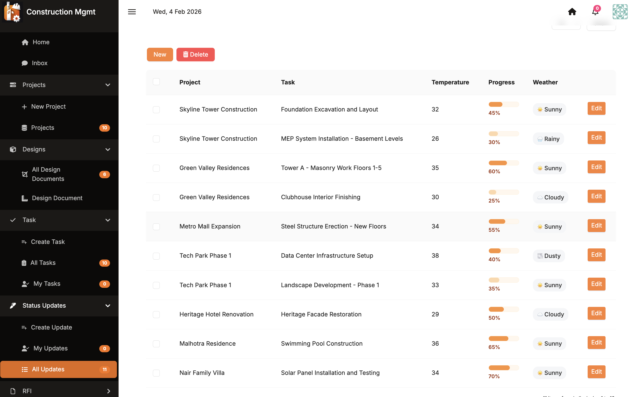Maintain daily site logs including weather conditions, progress percentages, blockers, and productivity tracking.
