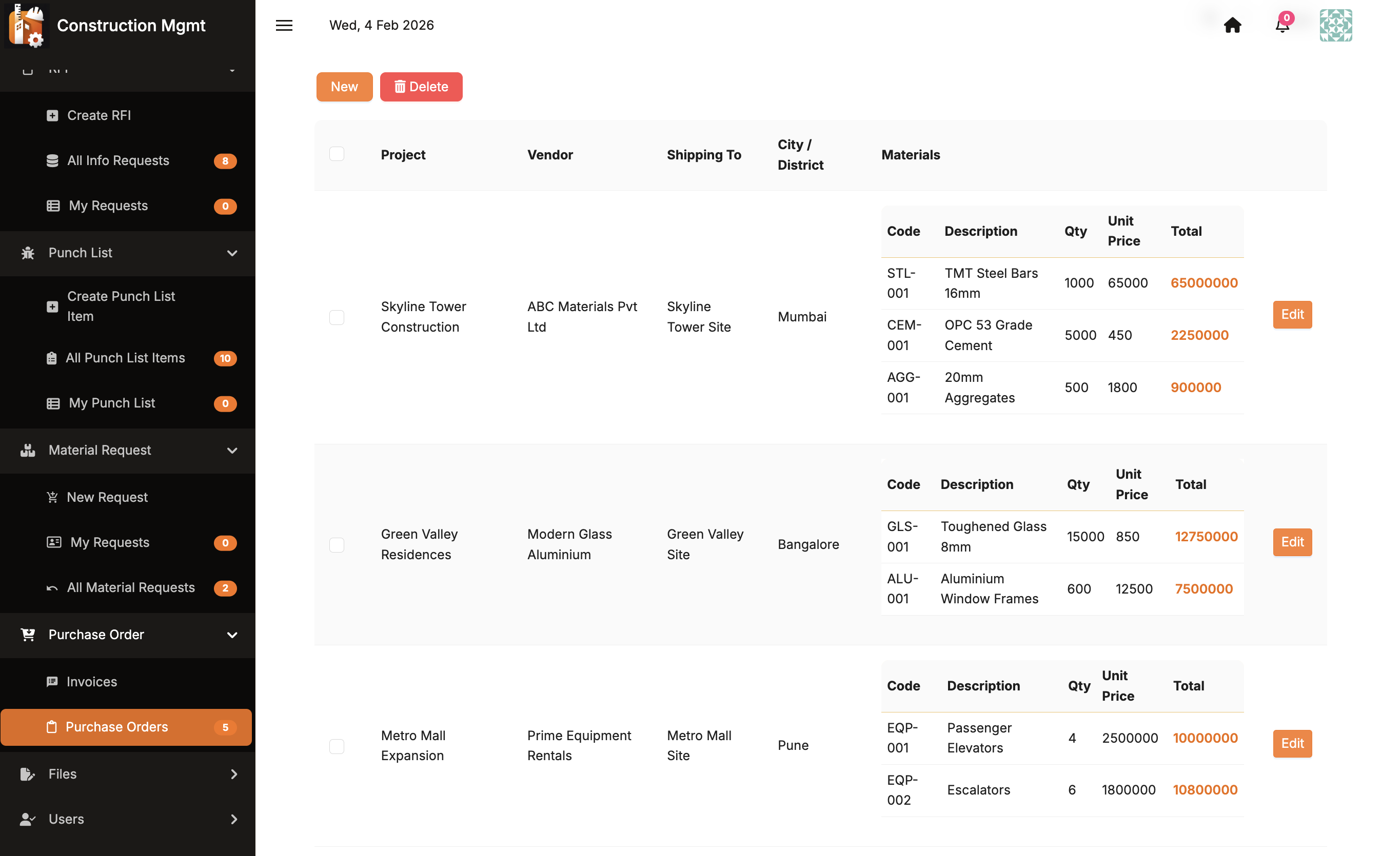 Manage suppliers, subcontractors, purchase orders, and multi-line material requests with approval workflows and project-linked costing.