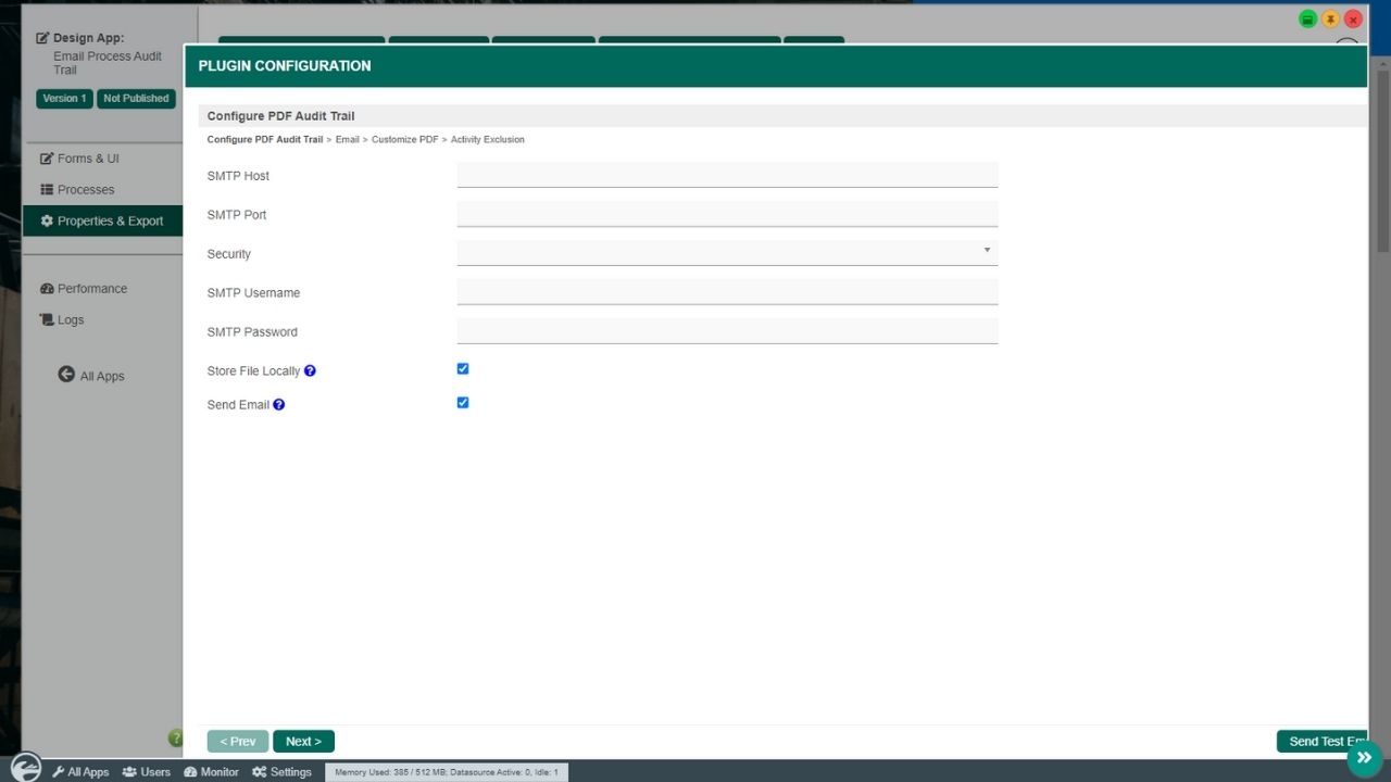 - In your app, go to "Properties & Export -> Set Plugin Default Properties" and choose the PDF Audit Trail. Configure the email properties accordingly.