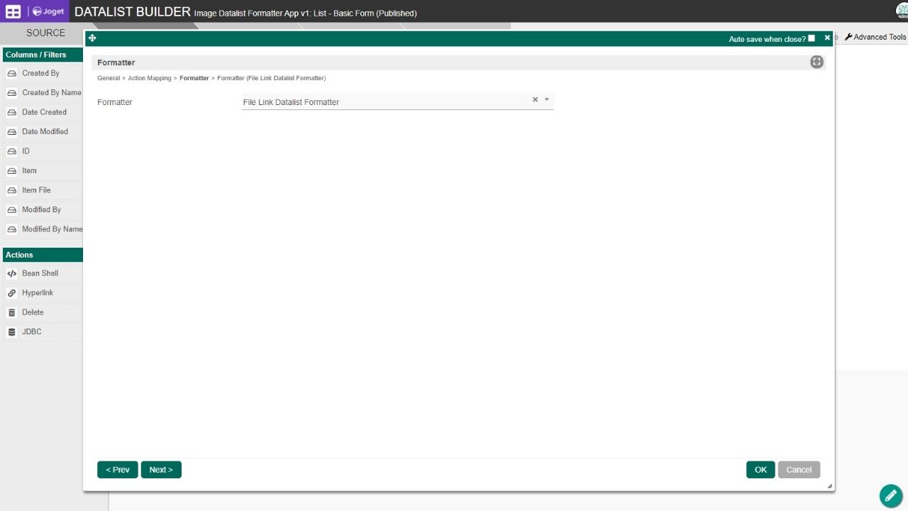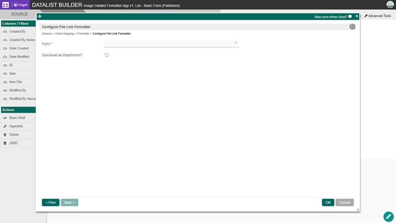 Note that Joget does not support using Action mapping (BeanShell) with Formatter (File Link Datalist Formatter) in your datalist.