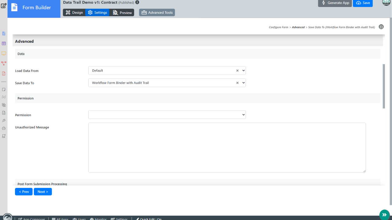 Form Store Binder Audit Trail would allow to store data that have been modified as audit trail data.