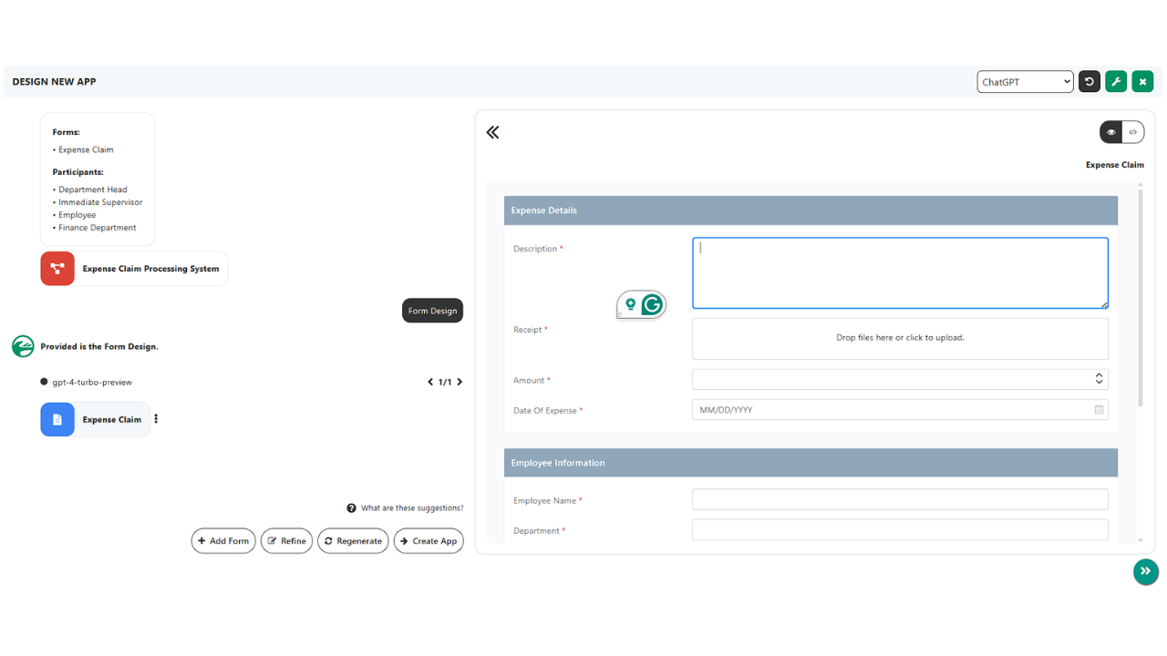 The Purchase Requisition App shown in the screenshot above is a sample output app generated by the Generative AI Plugin.