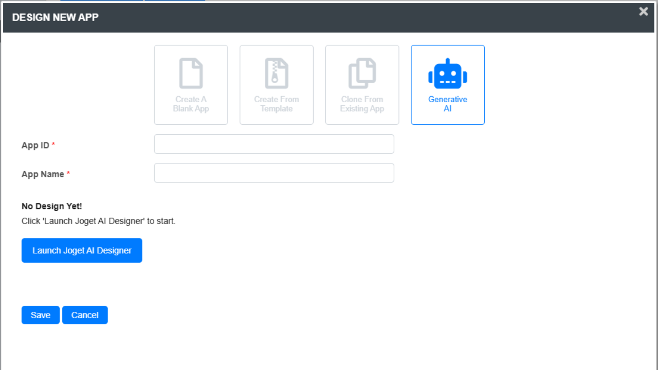 - Joget AI Designer adds a new option under the Design New App page to assist with app creation using a Generative AI language model.