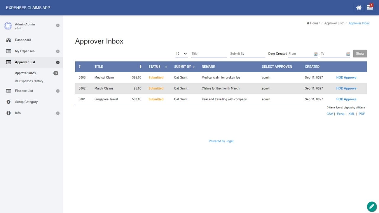 - Expense claim is routed to the selected HOD for approval.