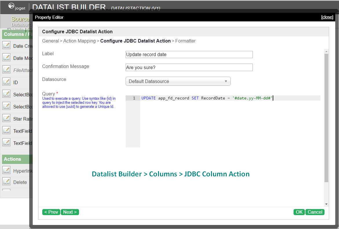 - Provides a new action button or hyperlink in any columns in your list. The action button can perform a JDBC SQL action (example an update or delete statement) to execute on the selected record when the user clicks the column hyperlink.