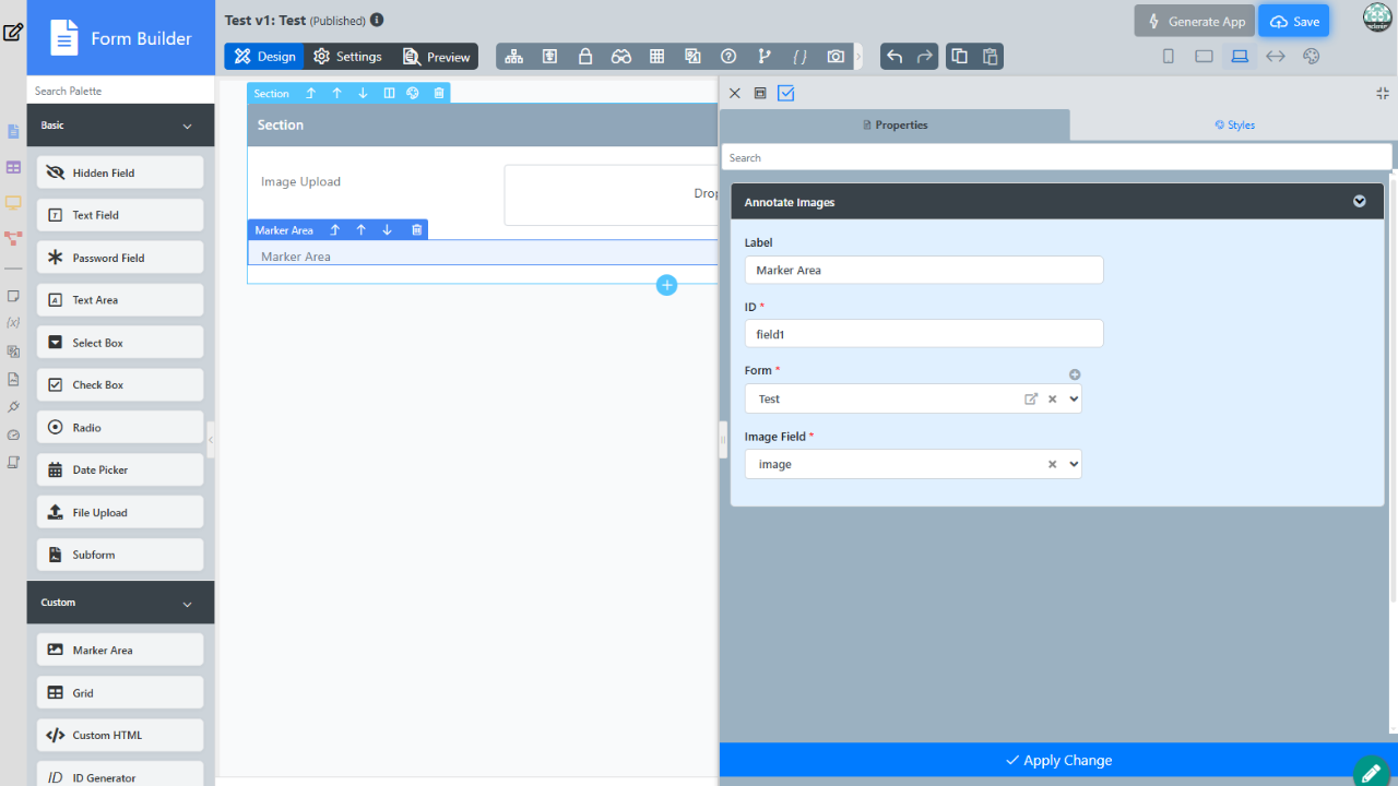 - Marker Area Form Element allows users to annotate on images in the runtime.