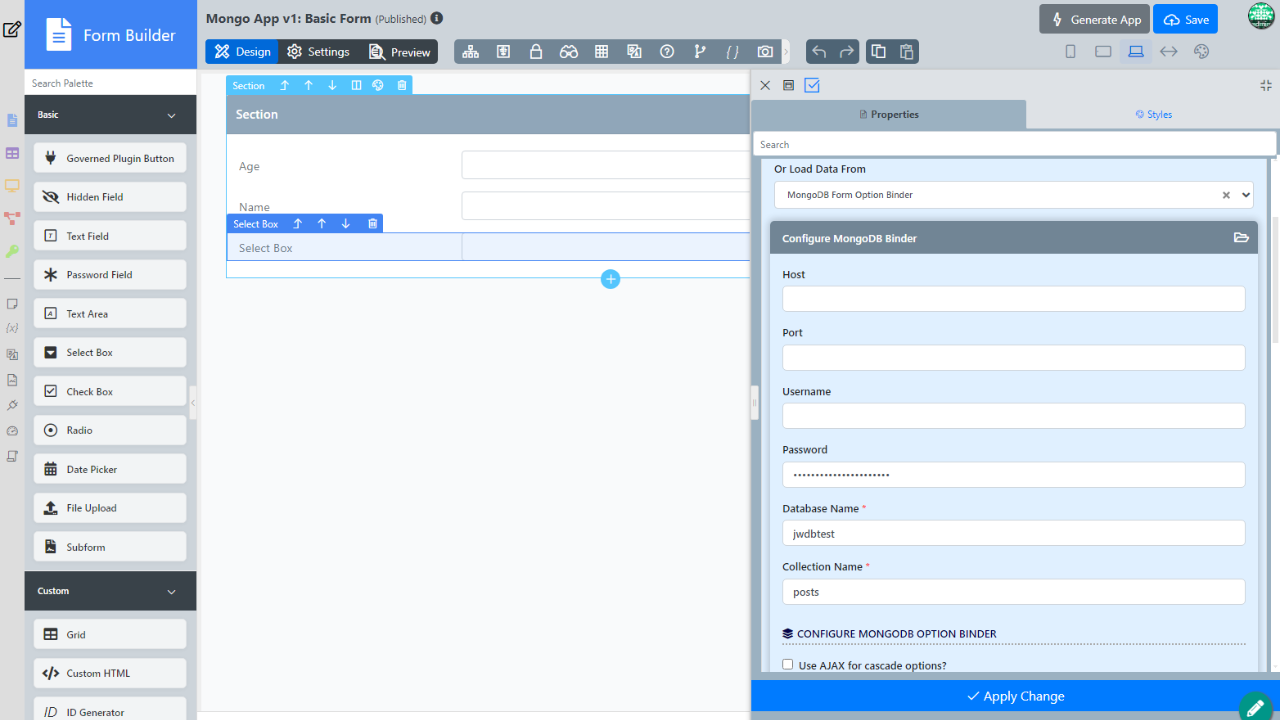 - Form Options Binder - To populate options field with data retrieve from MongoDB database.