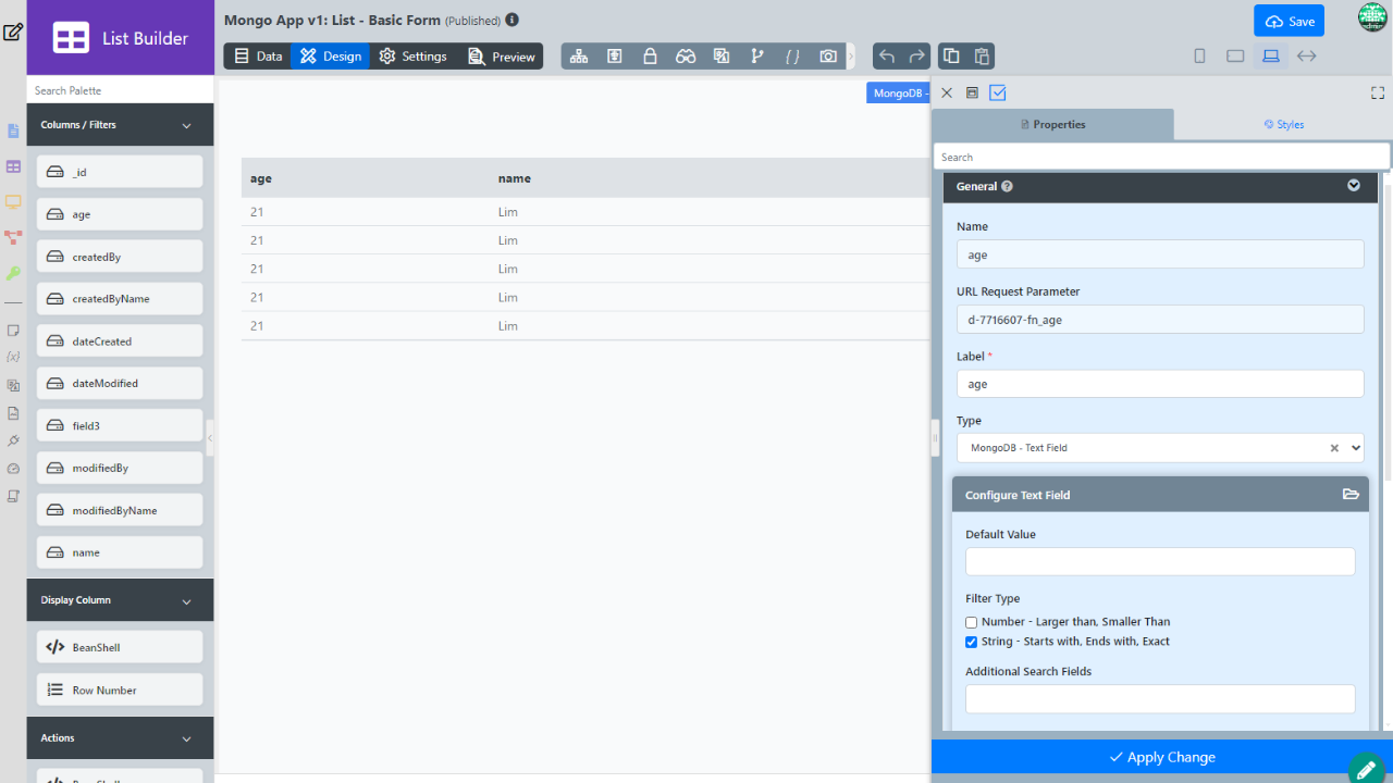- Data List Filter - To filter the dataset to refine the result. Includes types for: Date, Date Range, Number, Options, Text Field.