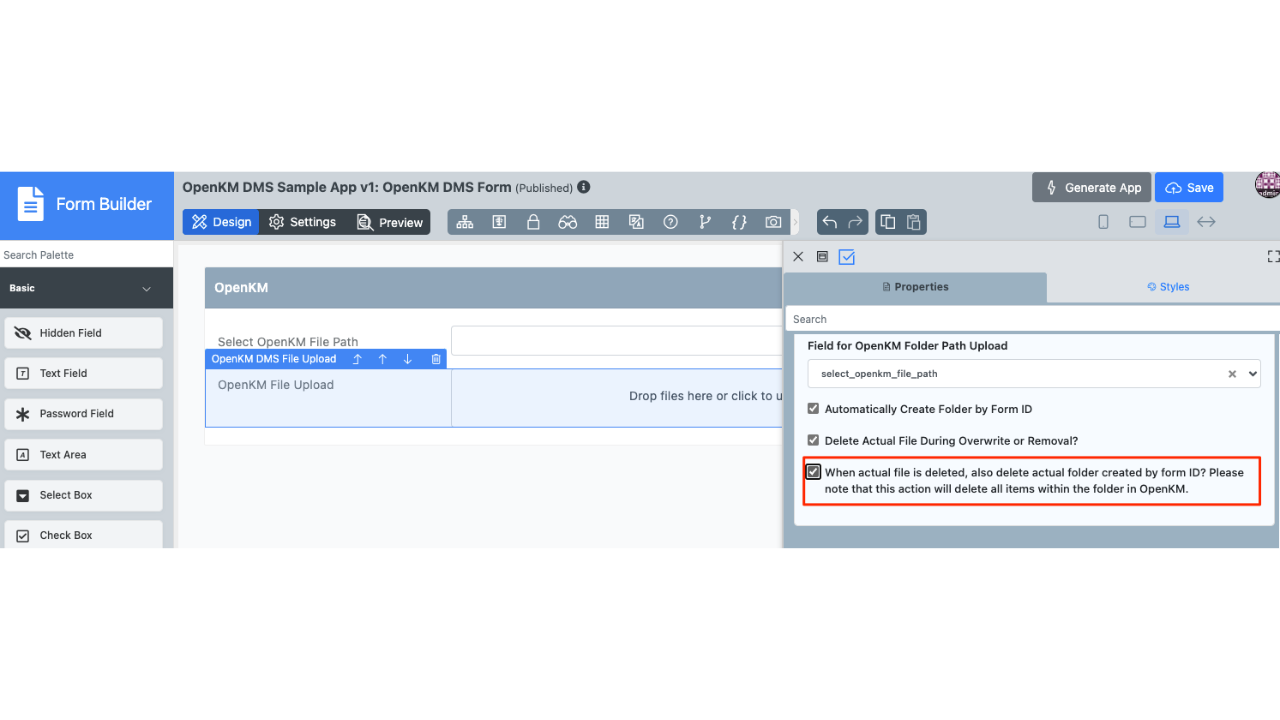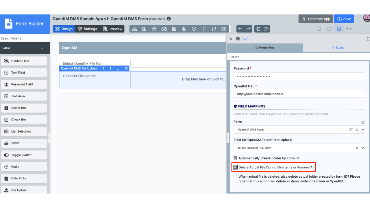 - File Upload Element - Upload files to OpenKM. Bind folder paths from the select box field that uses the Form Options Binder. Able to choose whether to create folder that follows Joget form ID when uploading.