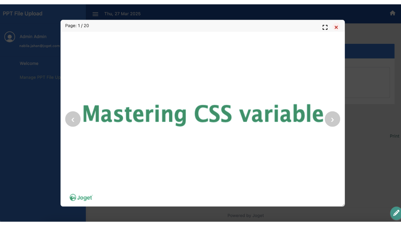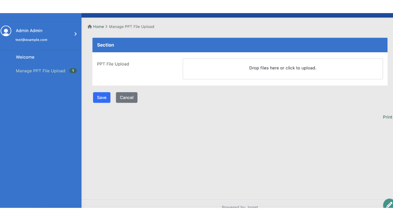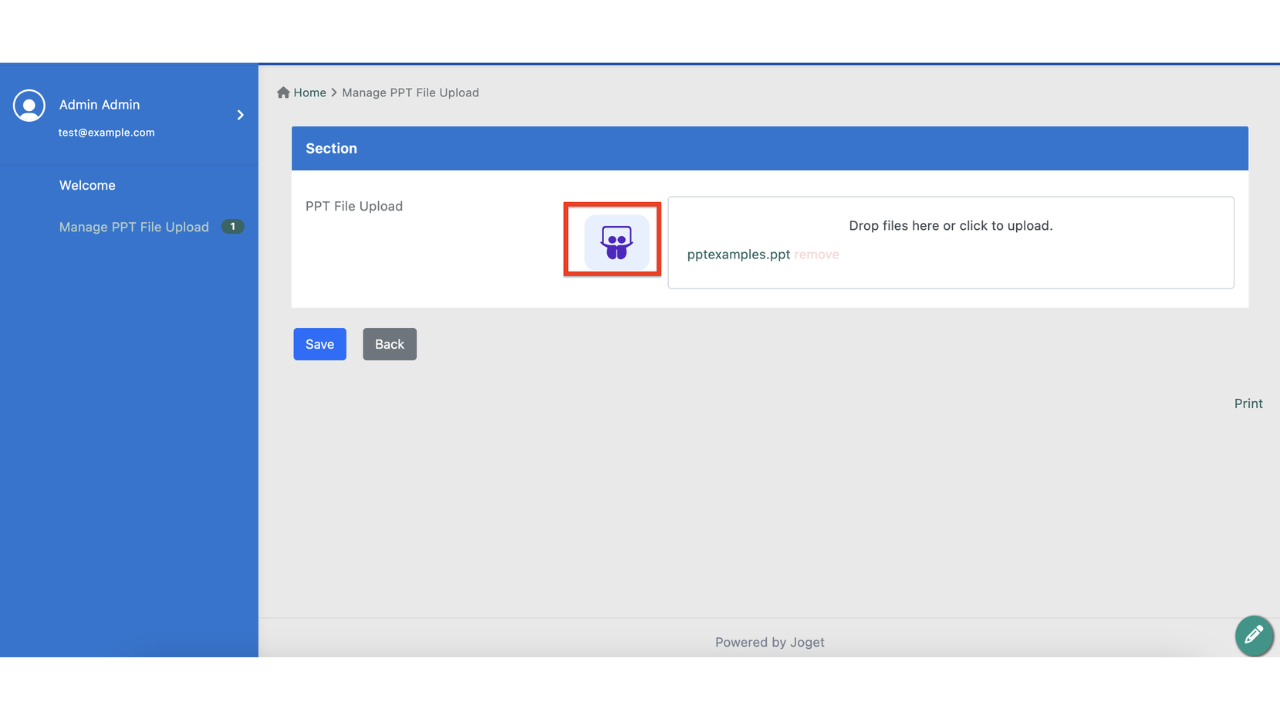 The PPT File Upload plugin enables PowerPoint file uploads and provides an embedded slideshow viewer for viewing presentations with a click of an icon.
