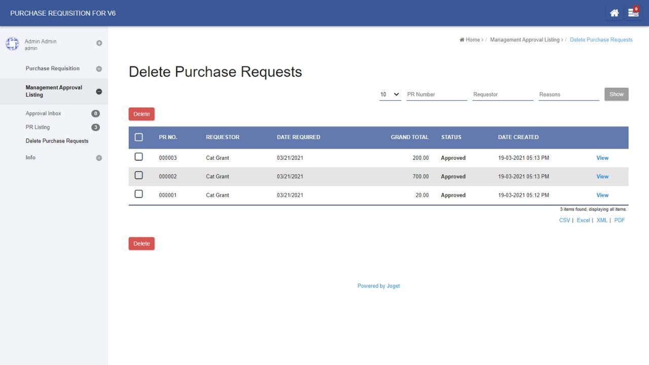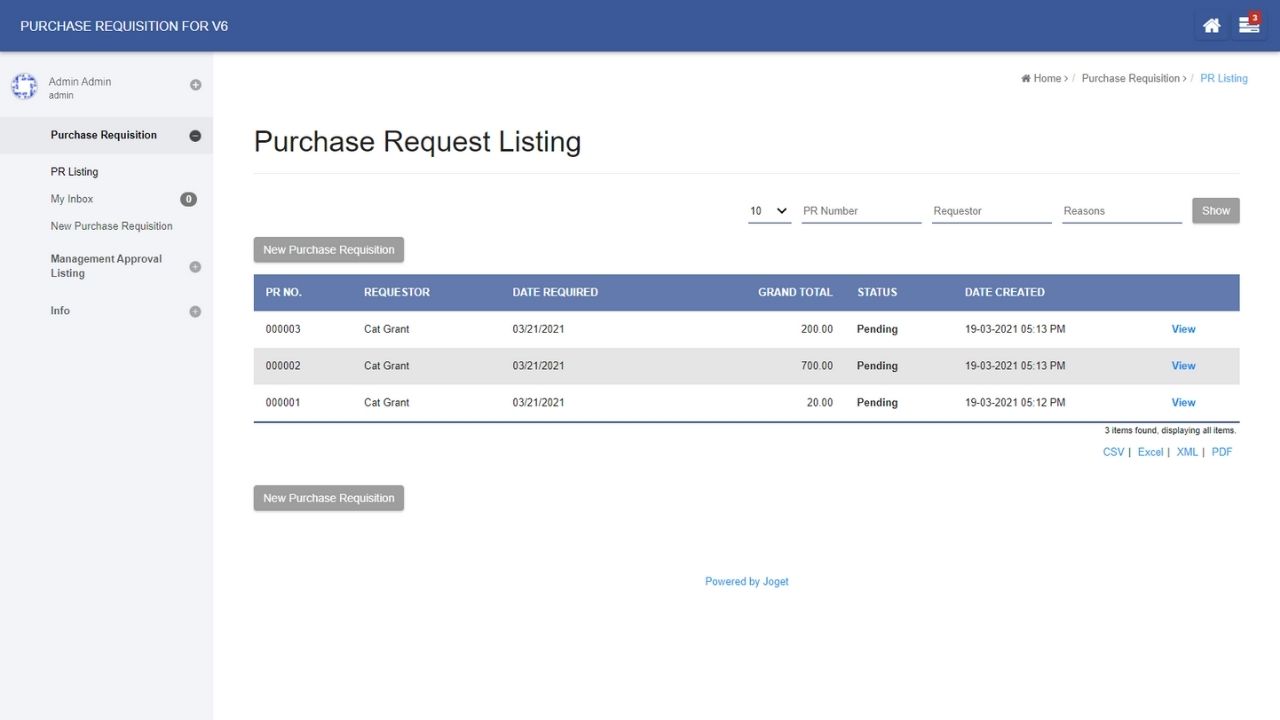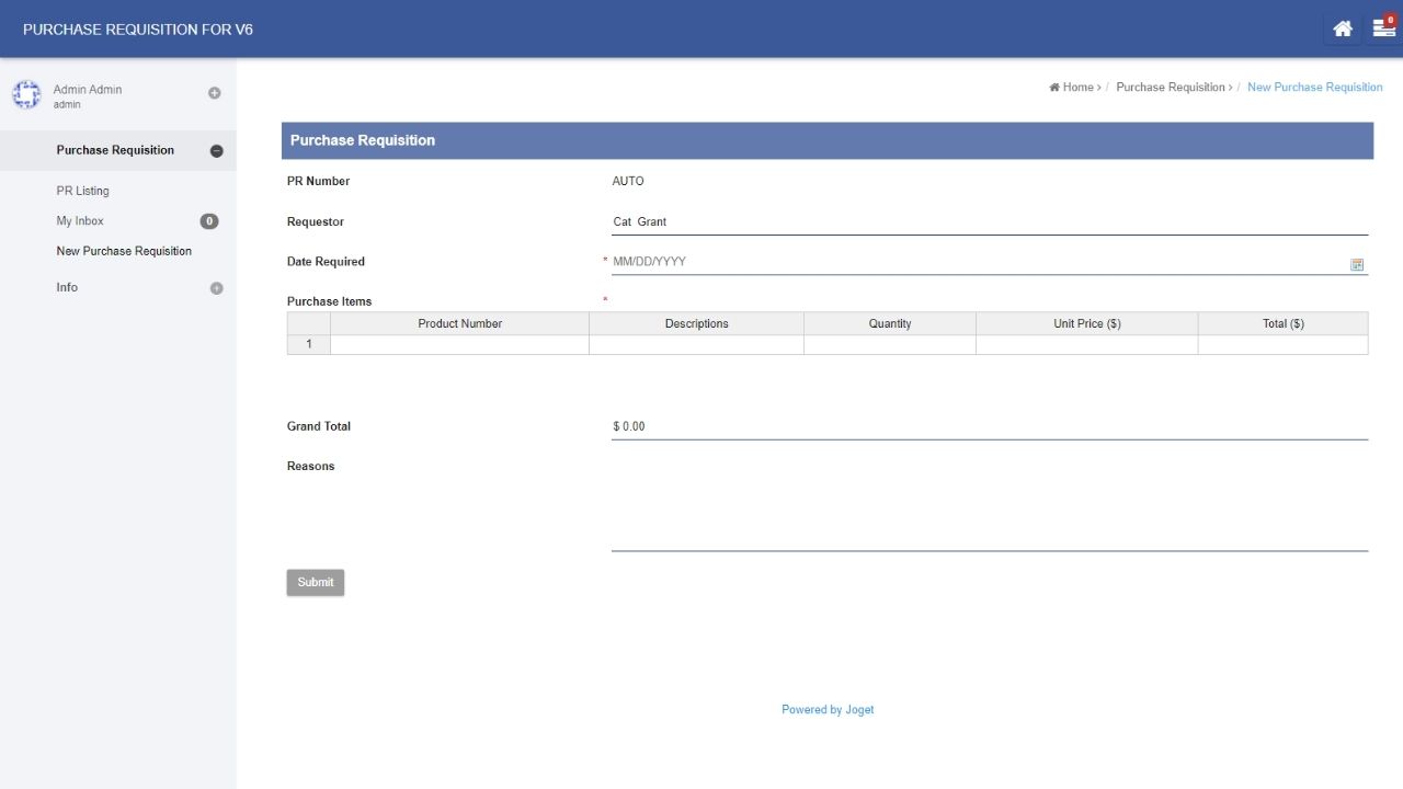 This is a Purchase Requisition app for Joget v6 Professional/Enterprise for employees to make purchase requisitions for any company items or assets that require approval from the management.