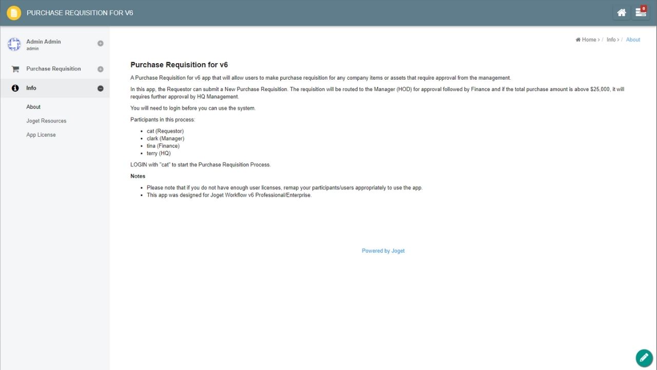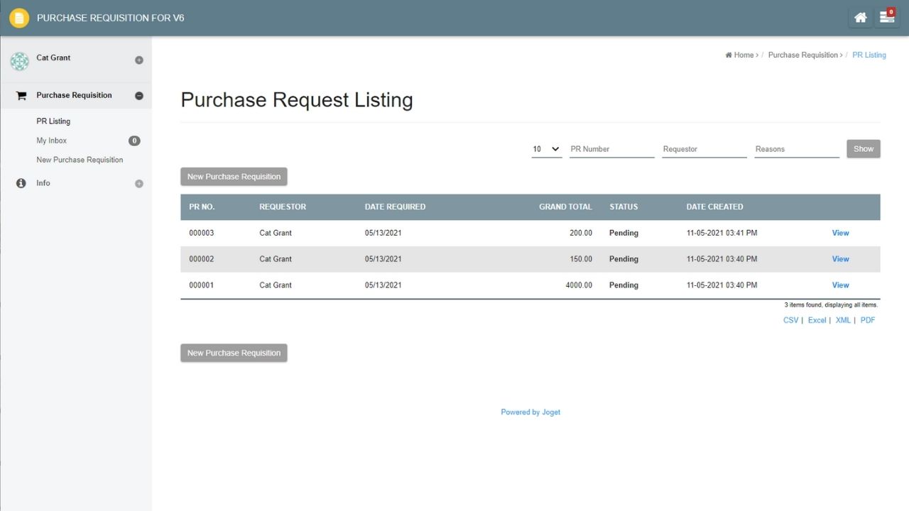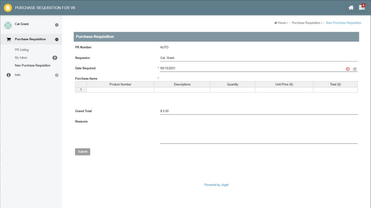 This is a Purchase Requisition app for Joget v6 Professional/Enterprise for employees to make purchase requisitions for any company items or assets that require approval from the management.