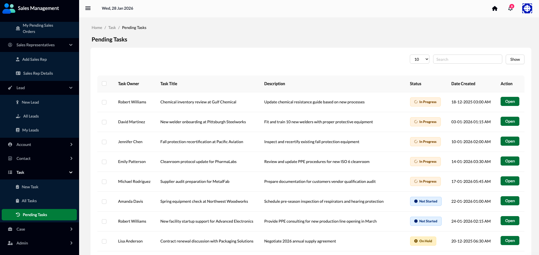 - Task Management - Create, assign, and track sales activities with due dates, priorities, and links to related leads, accounts, or opportunities.