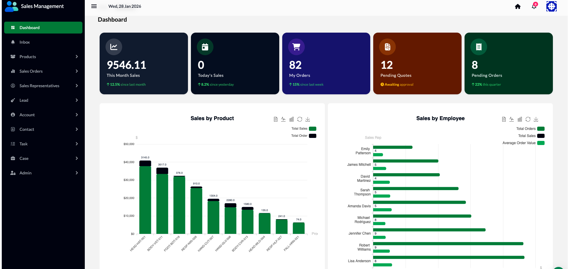 - Dashboard Analytics - View real-time KPIs including monthly/daily sales, pending quotes, order status, sales by product, and employee performance.