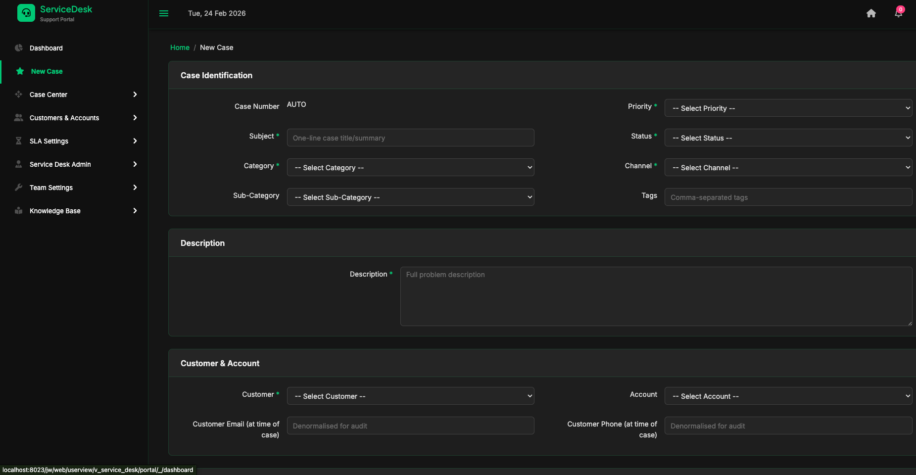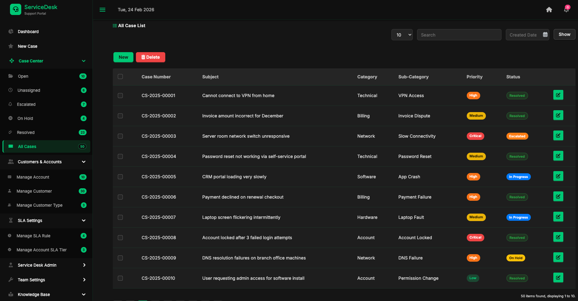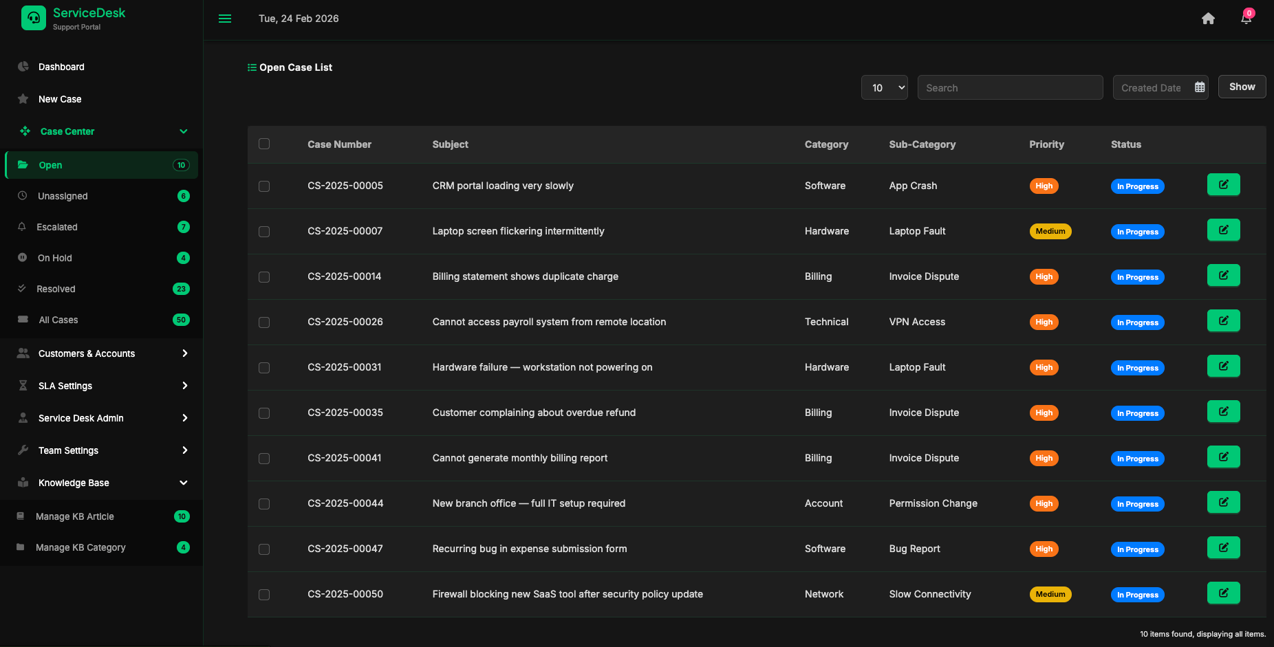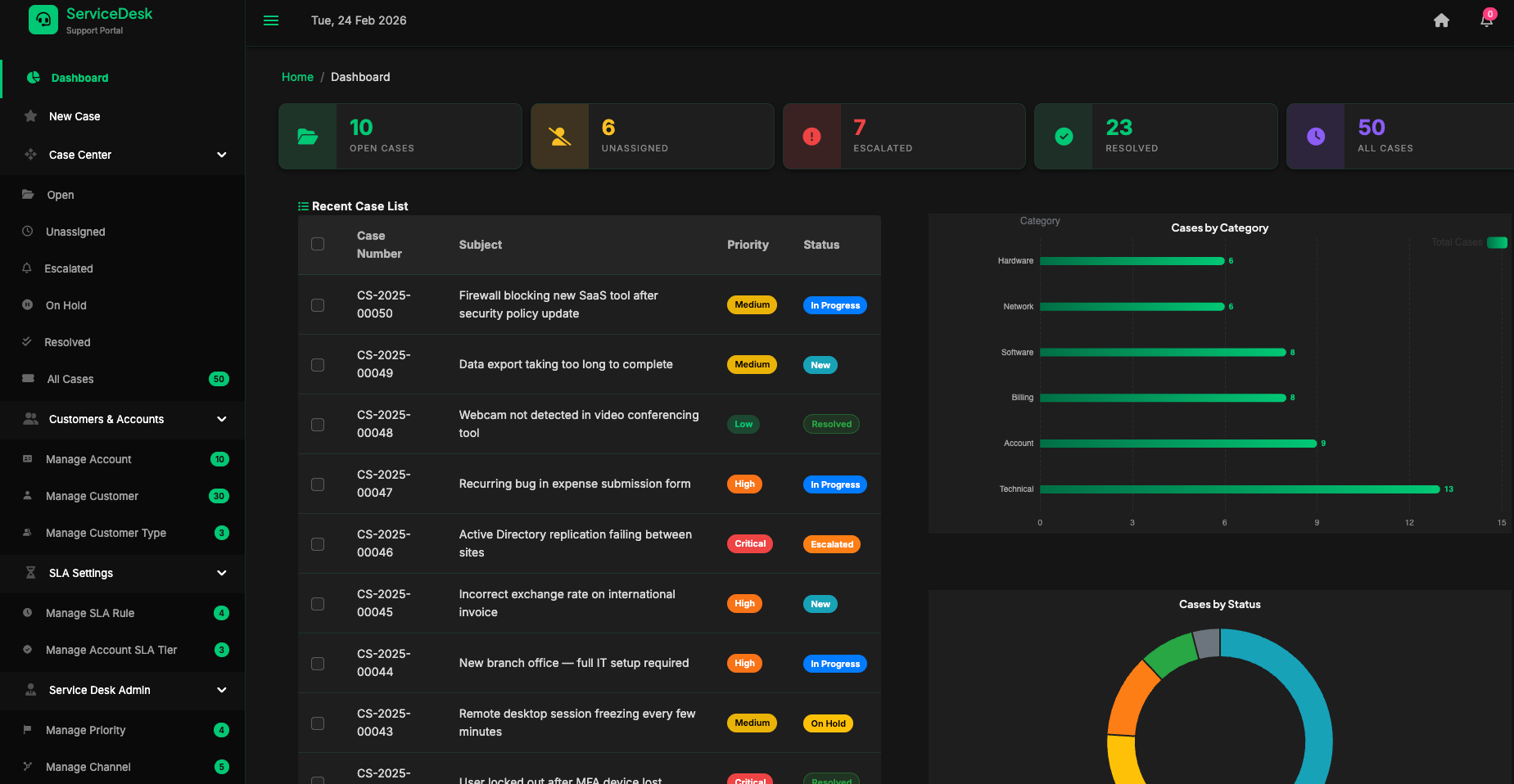 Service Desk application, built using DX 9 Theme Builder and styled with the Neon Ops dark theme, centralizes support operations into a structured and organized platform. It enables teams to manage cases, customers, categories, priorities, statuses, and related records within one organized interface.