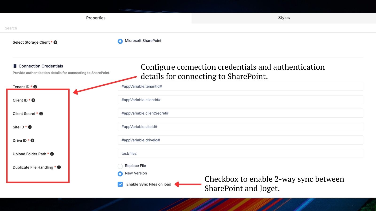 Two-way integration and document sync (upload, replace, and delete) between SharePoint and Joget.