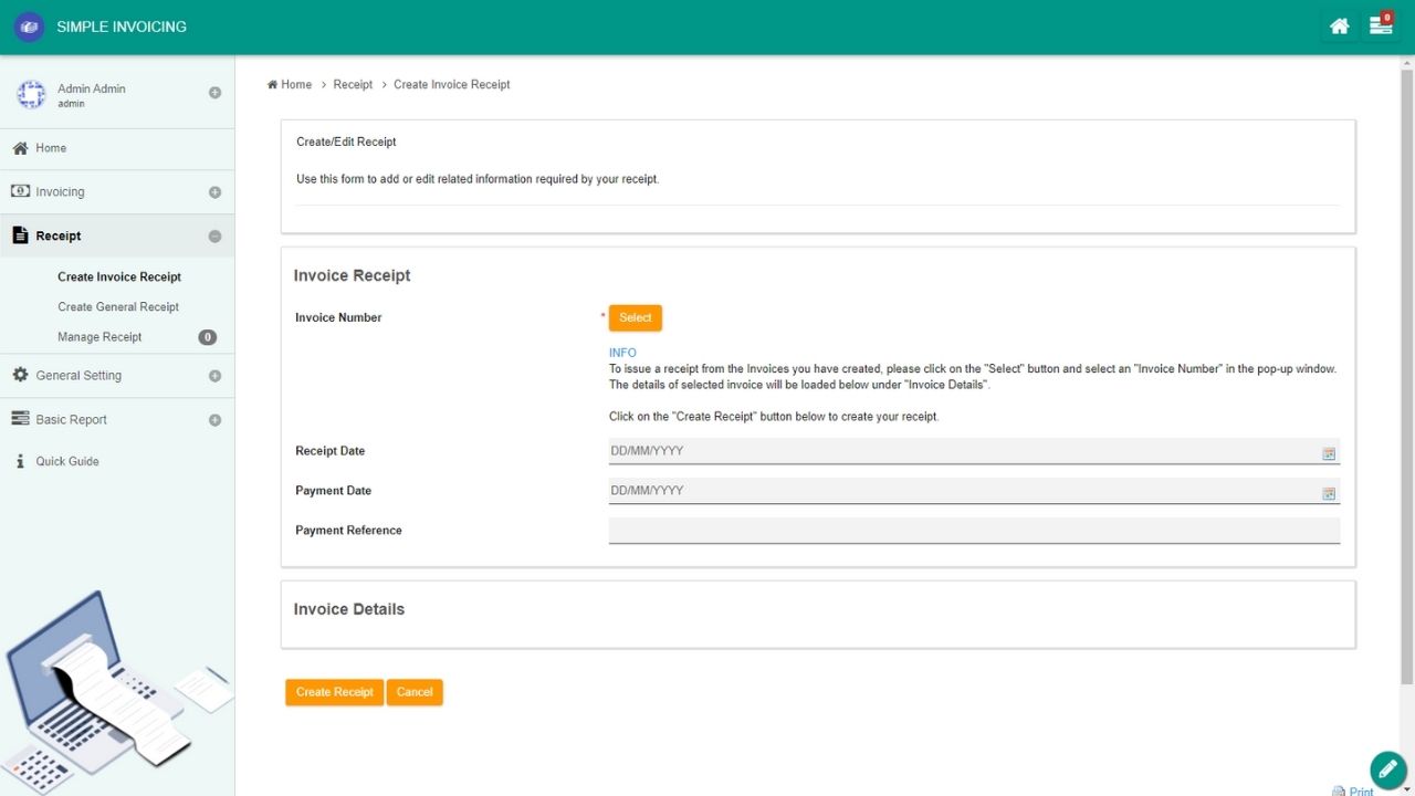 The Simple Invoicing app also comes with Receipt management. You can generate a receipt from your invoice or create a general receipt for any payment.