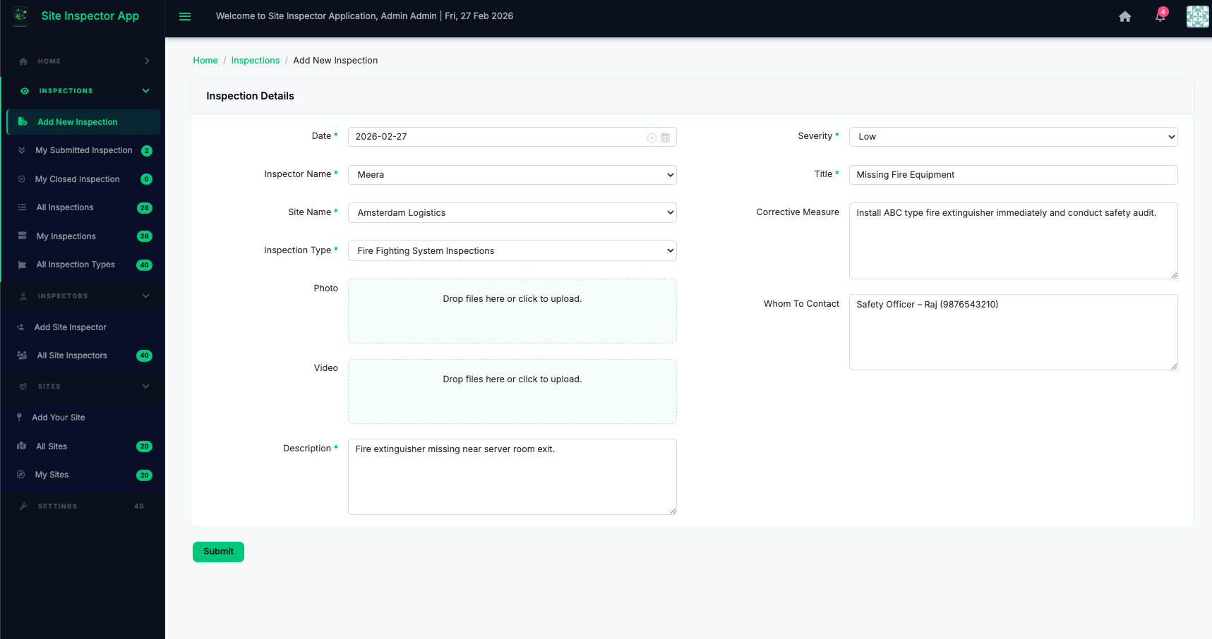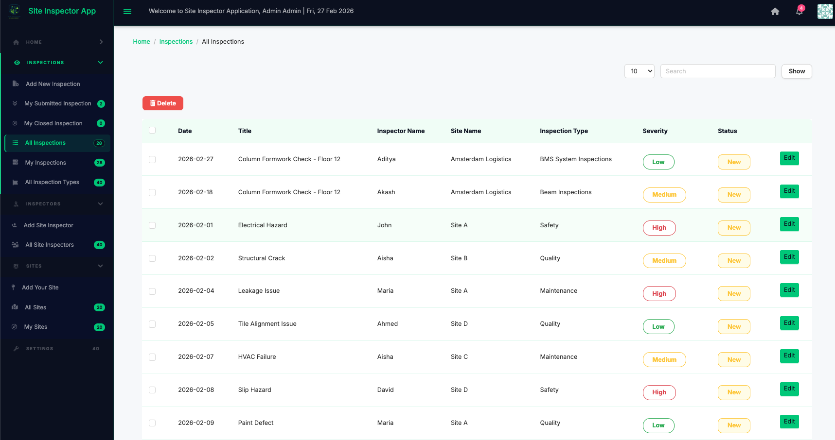 - Inspector Registry – Store and manage site inspector contact details, assigned sites, and inspection history in one centralized place.