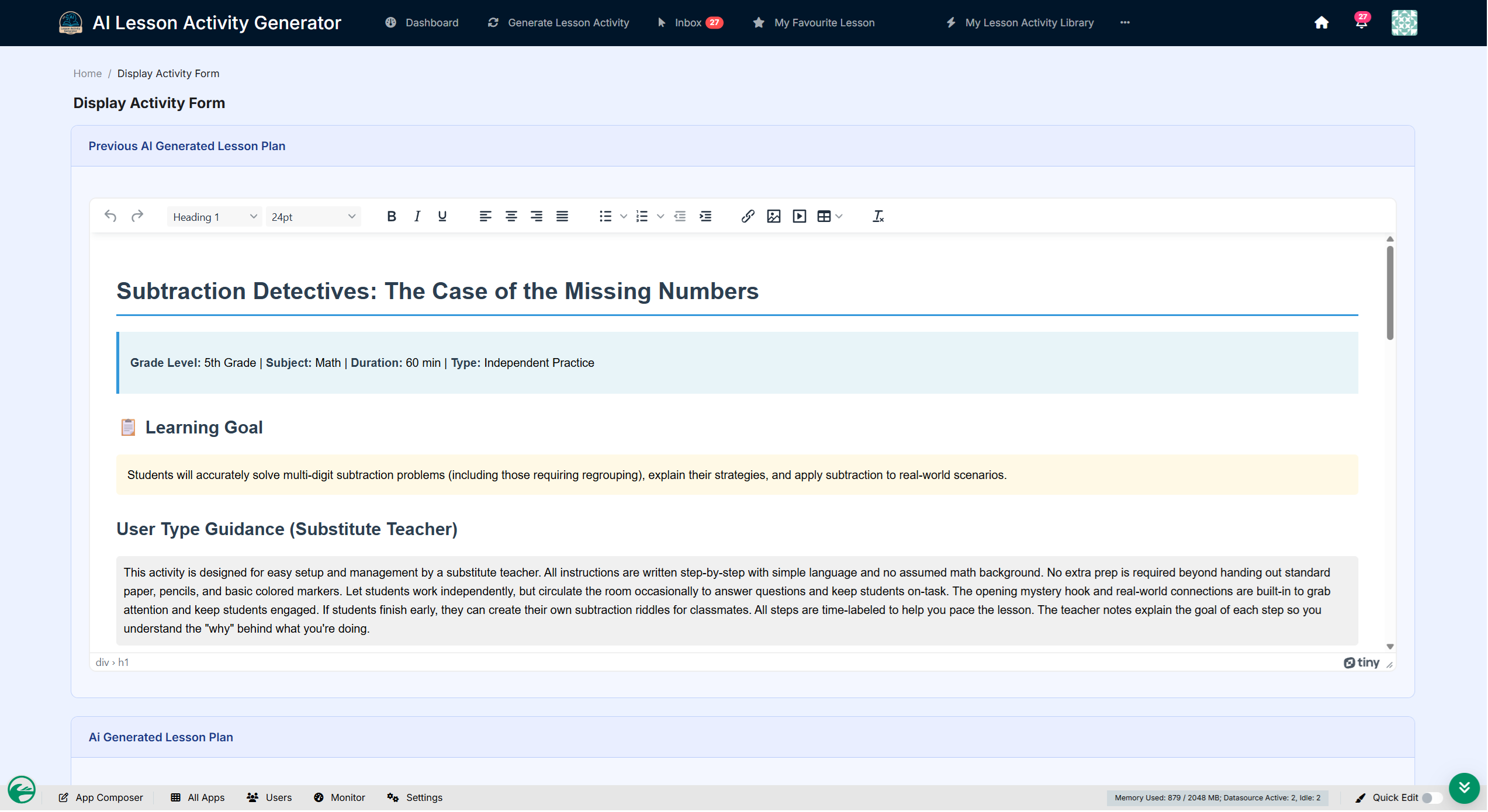 - Activity Creator AI analyzes the lesson context and generates suitable activities such as discussions, exercises, group work, and short assessments.