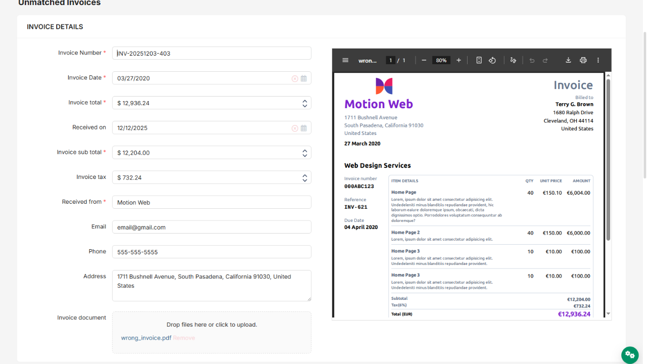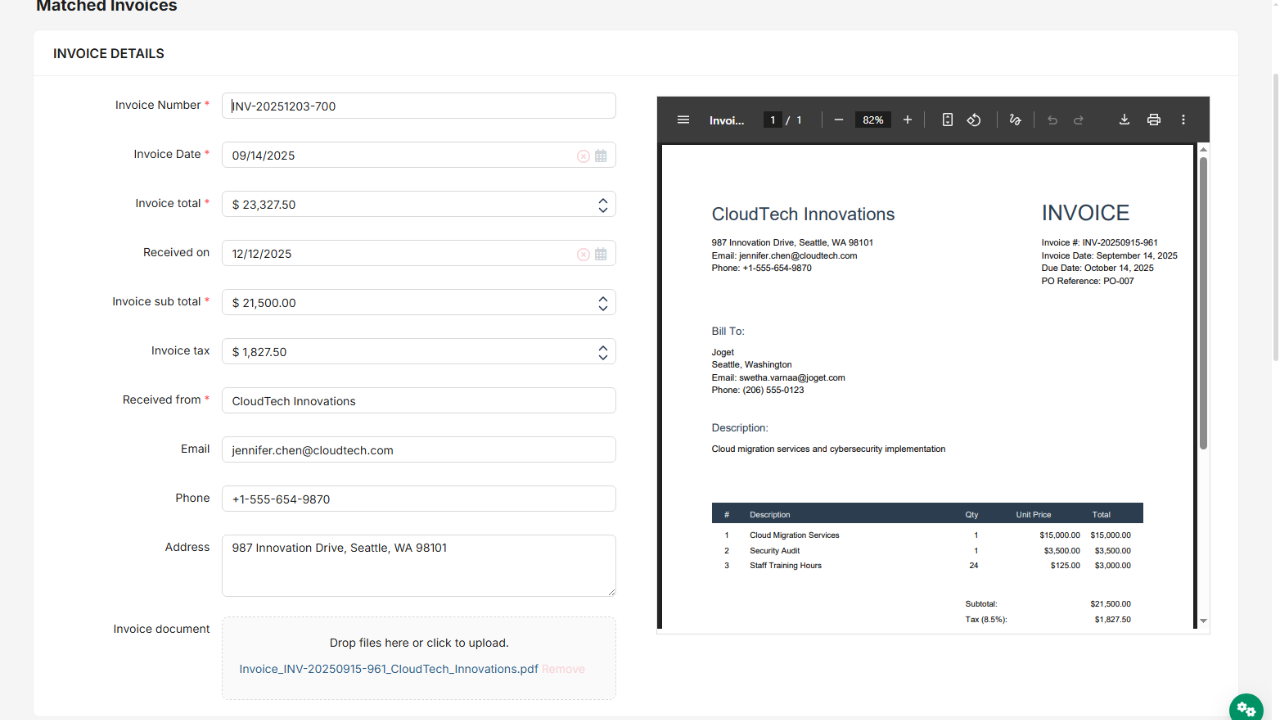 - Upload Invoices for the AI to extract data so it can review and decide whether it matches or not to be submitted.