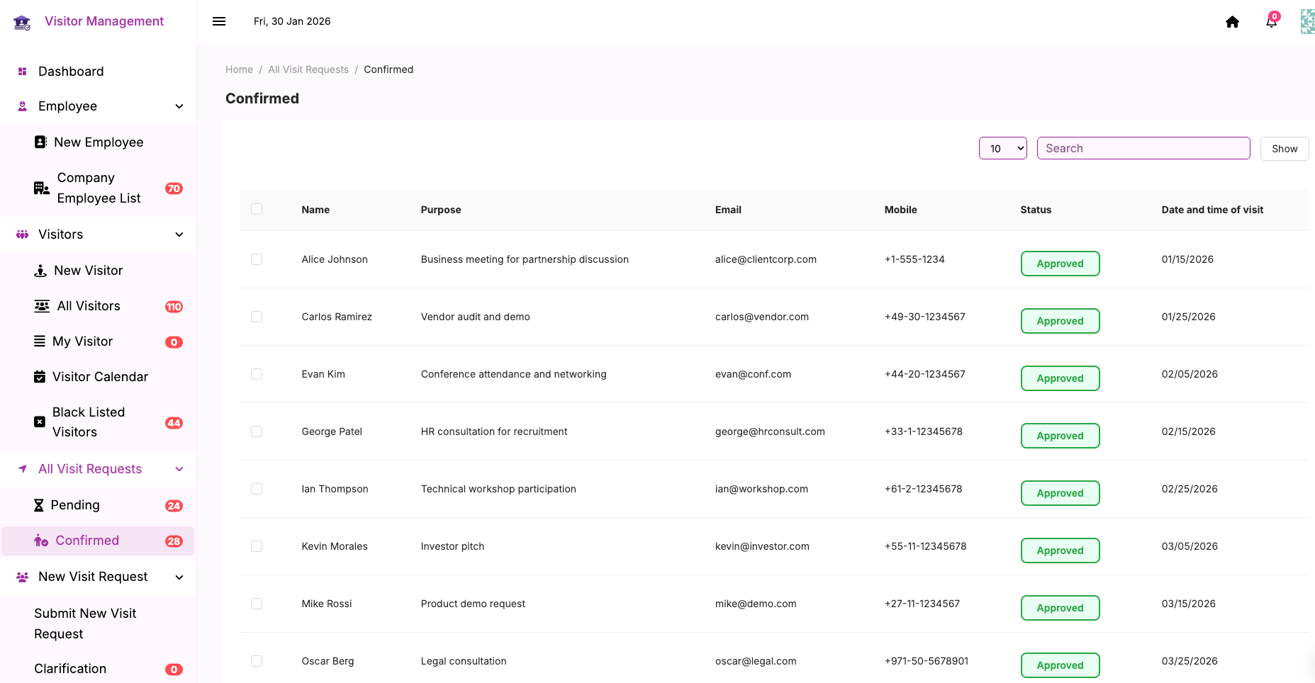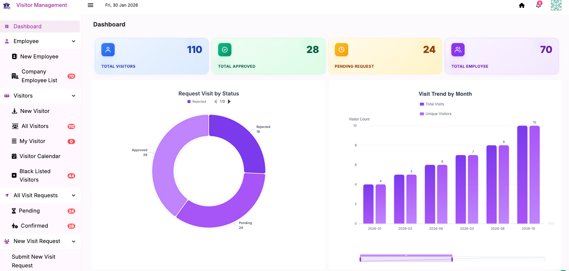 - Employee Access - Let employees view details of their scheduled visitors and track visit history